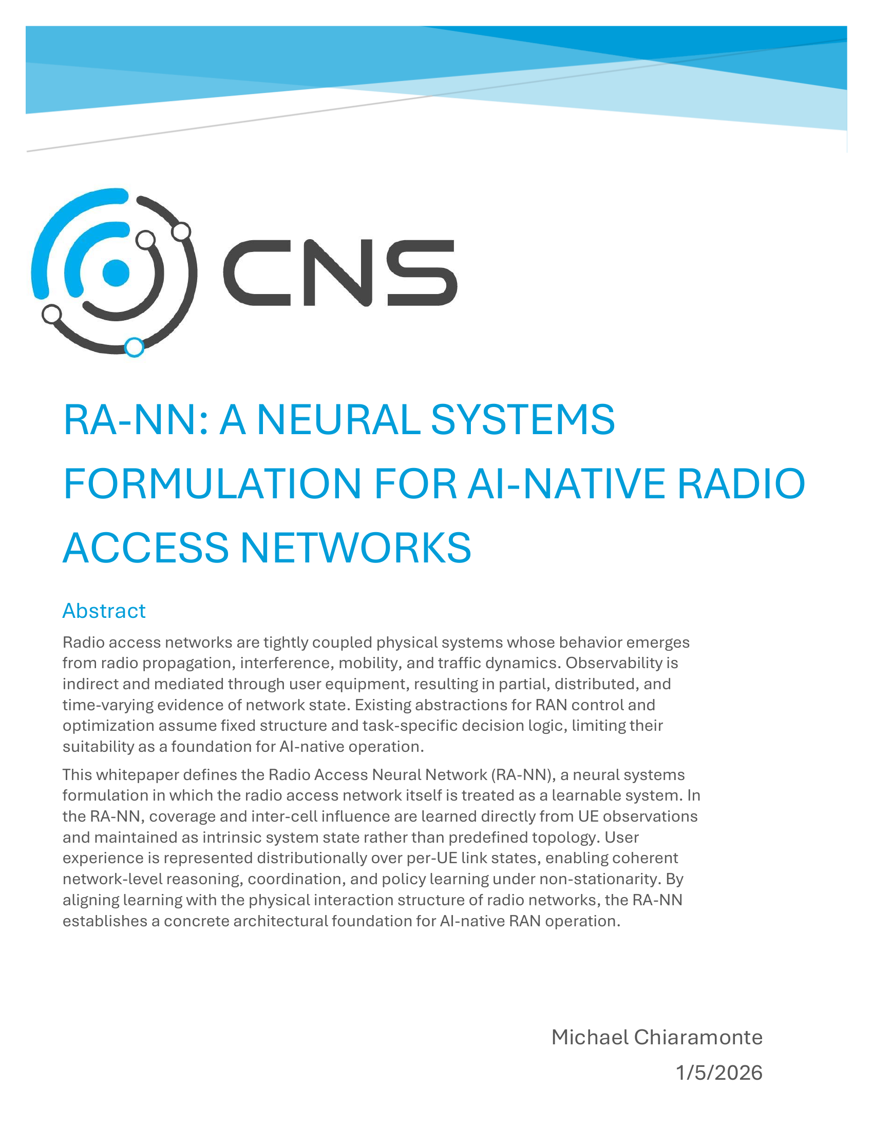 This paper introduces the RA-NN — a neural systems formulation that treats the radio access network itself as a learnable system. Rather than applying AI models on top of legacy RAN abstractions, the RA-NN defines a new architectural foundation where the network learns its own structure from per-UE observations, builds a shared latent substrate, and derives control policies directly from that substrate.