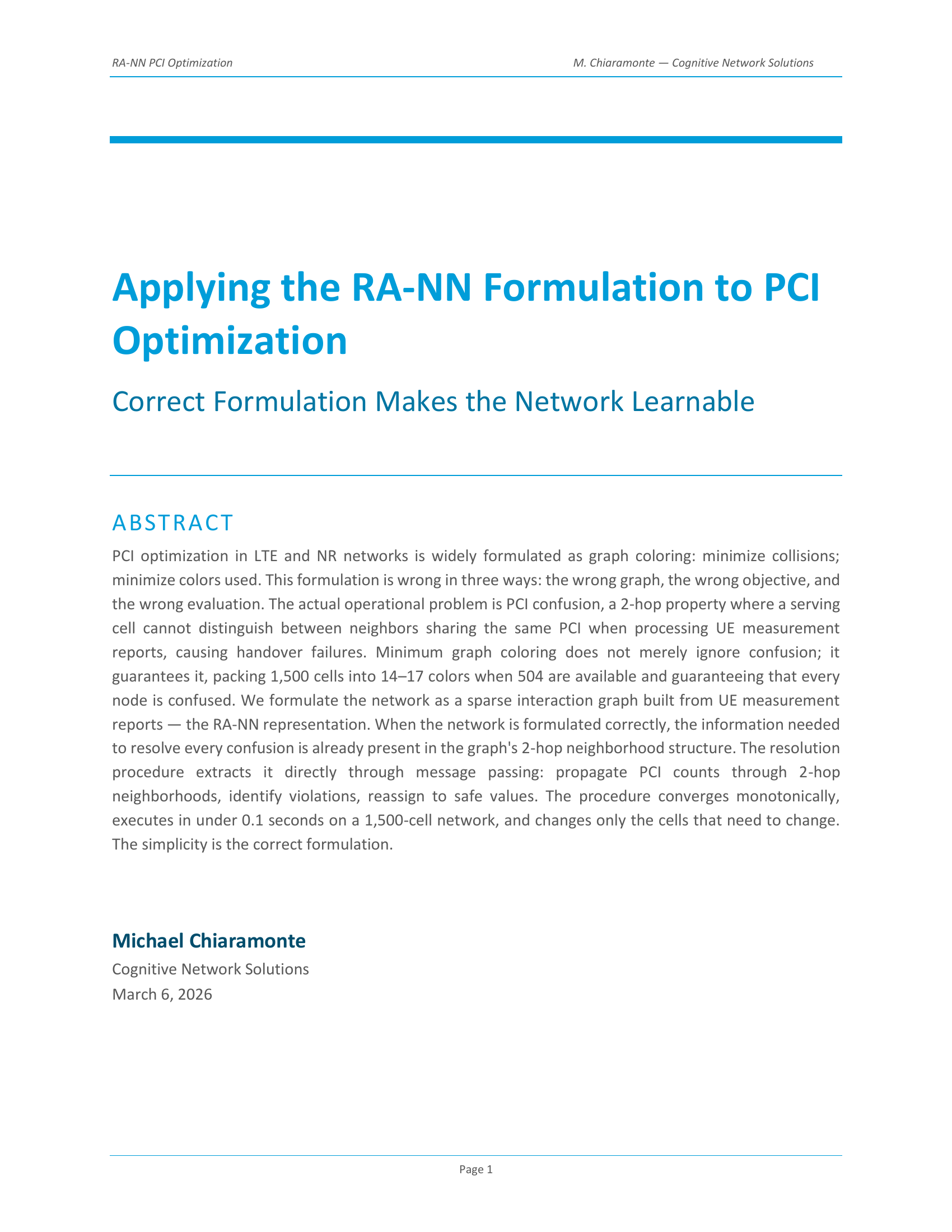 PCI optimization has been misformulated as graph coloring — the wrong graph, the wrong objective, and the wrong evaluation. This paper applies the RA-NN formulation to PCI planning, constructing a sparse interaction graph from UE measurement reports and targeting confusion (the actual operational problem) instead of collisions. The resolution procedure uses message passing over the graph's 2-hop neighborhood structure, converges monotonically, executes in under 0.1 seconds on a 1,500-cell network, and changes only the cells that need to change.
